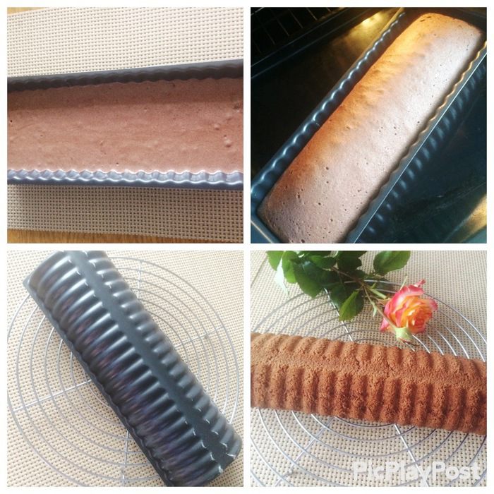 По истечении времени, форму с испеченным бисквитом переворачиваем на решетку и полностью остужаем. Аккуратно вынимаем бисквит из формы (я это сделала при помощи маленькой спатулы, т.к. форма ребристая). Если форма прямоугольная, достаточно пройтись ножом вдоль стенок и вынуть бисквит, но аккуратно.