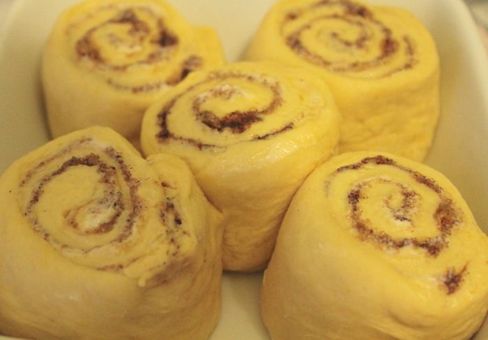 Скатать тесто в рулет, разрезать его поперек на кусочки и поместить их в форму на расстоянии 2 см друг от друга. Оставить булочки отдохнуть 30 мин. Выпекать при 180°С около 35 минут до легкого зарумянивания.
