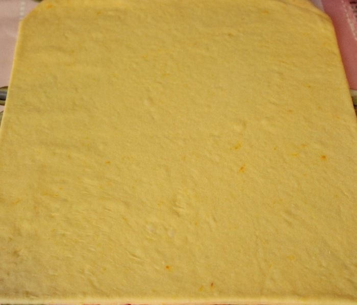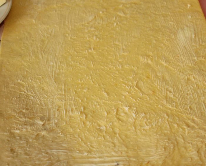 Разделить тесто на 3 части, раскатать каждую в прямоугольник толщиной около 3 мм.
