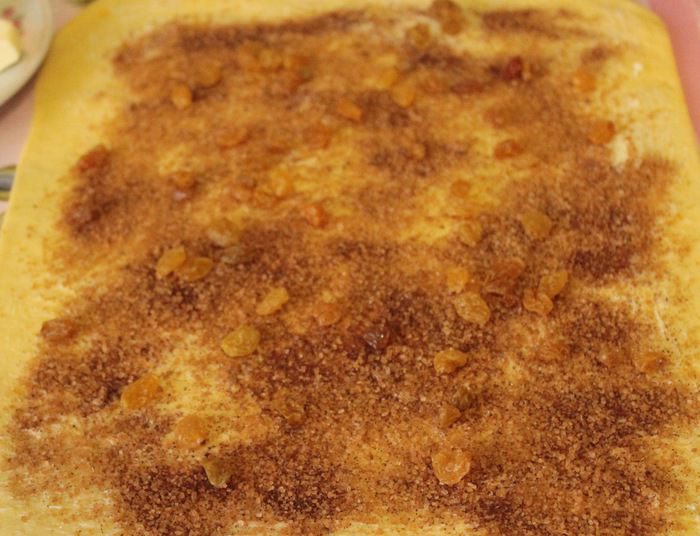 Посыпать смесью сахара с корицей, выложить произвольно изюм.