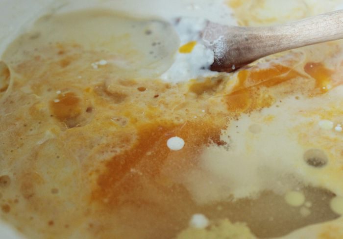 После того как смесь запузырится, добавить виноградное масло Biolio, тыквенное пюре, оставшиеся сахар и муку, мелко натертый корень имбиря.