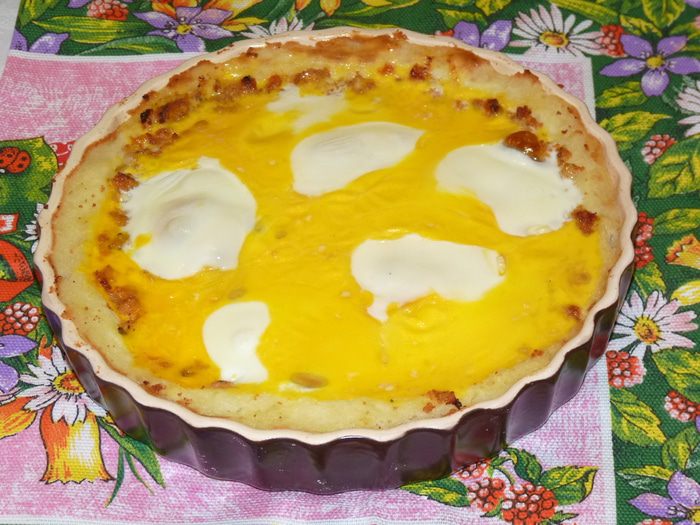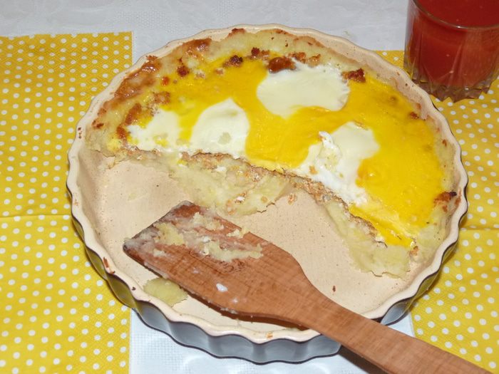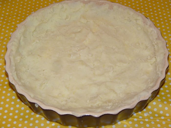 Форму для запекания смазать сливочным маслом и выложить пюре, разровнять. Бортики тоже из пюре.