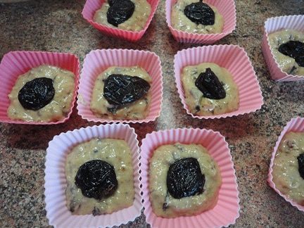 Соединить жидкие и сухие ингредиенты. В формочки (у меня поучилось 14 штук) выложить по 1 ст. л. теста. Выложить в каждую формочку по половинке или целому черносливу, сверху – оставшееся тесто.
