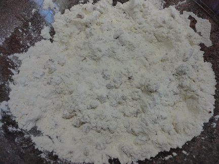 Муку просеять и смешать с разрыхлителем. Соединить с орехами и, если орехи склеились все же, размять немного руками.
