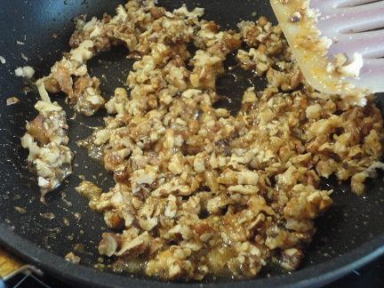 Орехи порубить, лучше ножом, а не в блендере. На сковороде растопить 60 г сахара, выложить орехи, часто помешивать, пока карамель не остынет, и чтобы орехи не схватились комком.