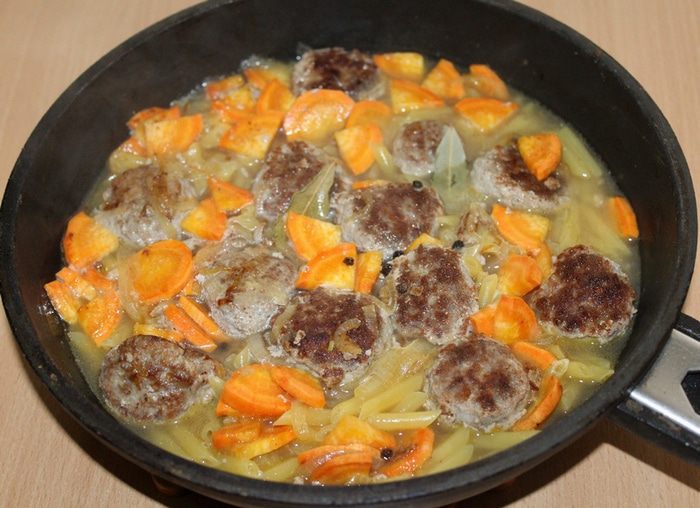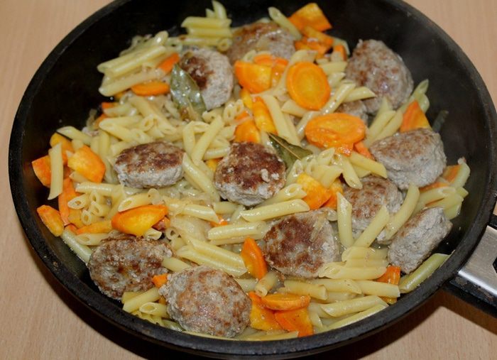 Добавить в сковороду сухие перья. Залить все это кипящим бульоном или водой так, чтобы было все содержимое покрыто, бросить лавровый лист и душистый перец. Довести до кипения, затем уменьшить огонь и готовить 10 минут под крышкой на среднем огне (а по сути время готовки пасты).