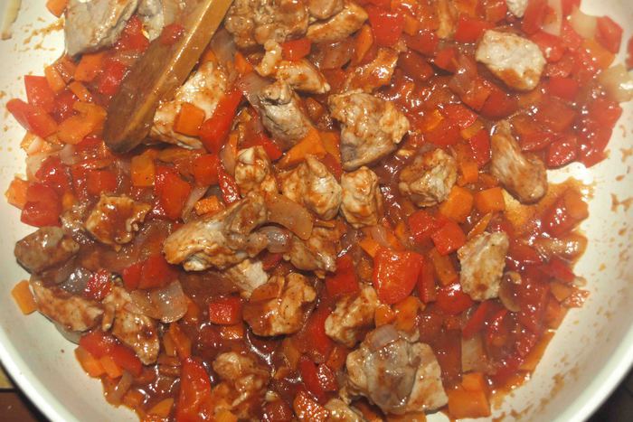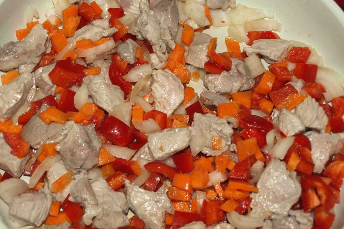 Добавить к мясу с овощами и потомить 5 — 10 минут.