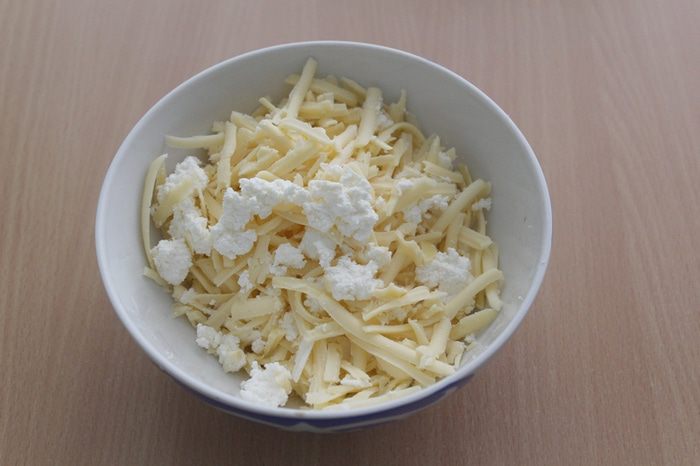 Приготовить начинку, смешать оба вида сыра.