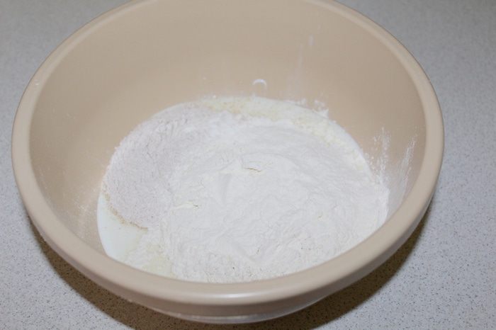 В миску налить кефир, добавить соль, сахар, соду, просеять обе муки.