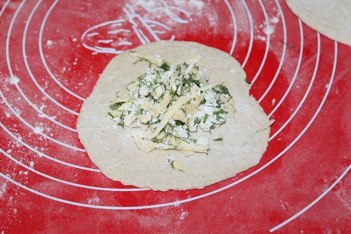 Раскатать лепешку, выложить начику.