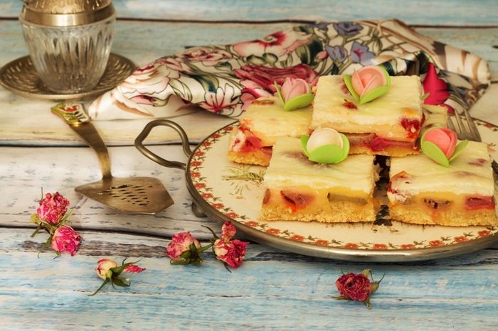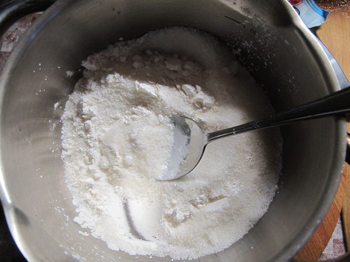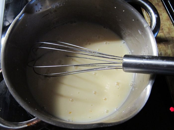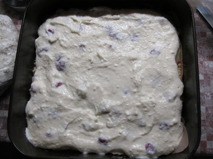 Порошок пудинга заливаем холодным молоком, добавляем сахар и варим на небольшом огне до загустения, постоянно помешивая. Снимаем с огня, примешиваем вяленую вишню и закрываем кастрюльку пленкой.