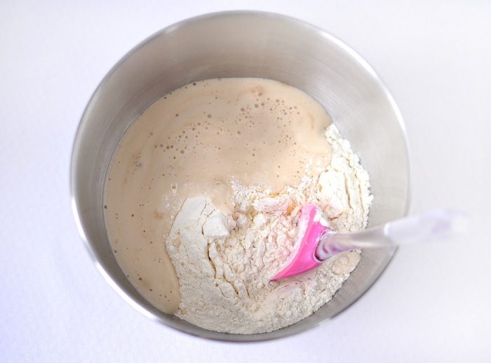 Посыпать тесто немного мукой, накрыть емкость полотенцем, поставить в теплое место для брожения. В процессе брожения дрожжевые грибы разлагают сахар, выделяется углекислый газ. Слишком большое кол-во углекислоты замедляет процесс брожения, поэтому тесто пару раз обминают (если мука со слабой клейковиной — 1 раз, с высокой — 2-3 раза, я обминаю 2 раза).