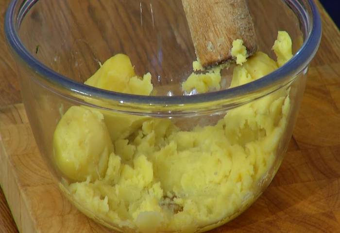 Картофель отварить до готовности в мундире, затем почистить и толкушкой размять в пюре.