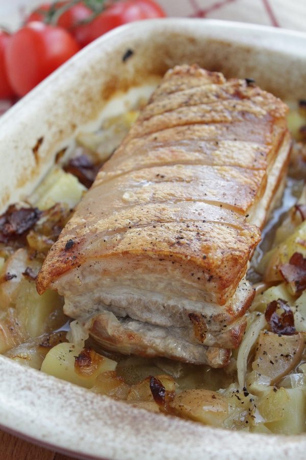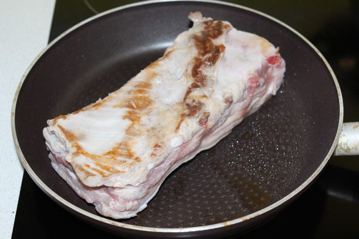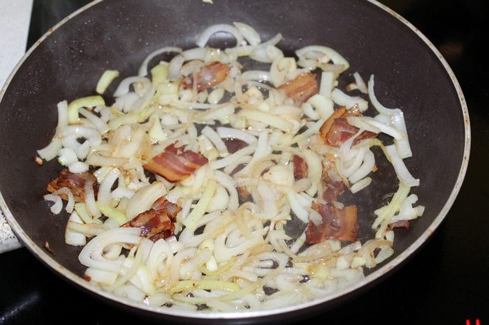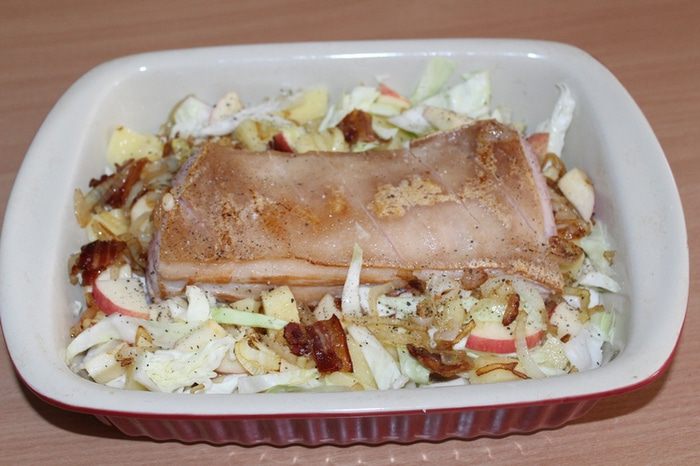 Сверху выложить мясо и обжаренный лук с беконом, дольки чеснока, посолить, поперчить по вкусу, добавить немного воды или овощного бульона (у меня была очень сочная капуста, жидкости понадобилось совсем немного).
