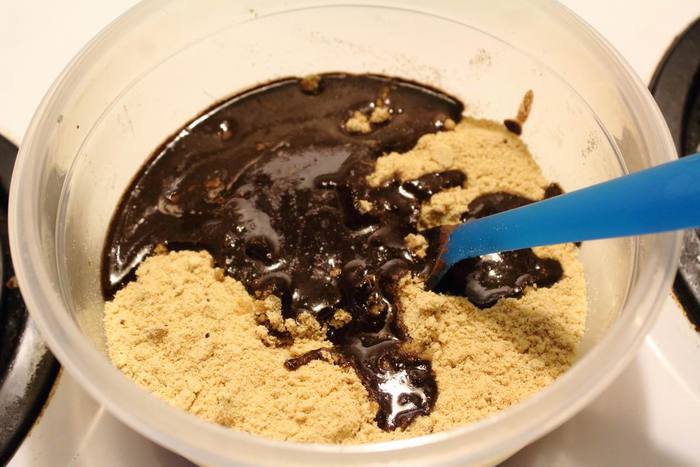 Если печенье было обычное, как у меня в этот раз, то в растопленое масло вмешать какао и уже готовую смесь вмешать в крошку печенья.