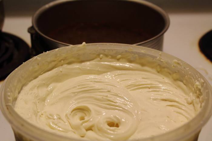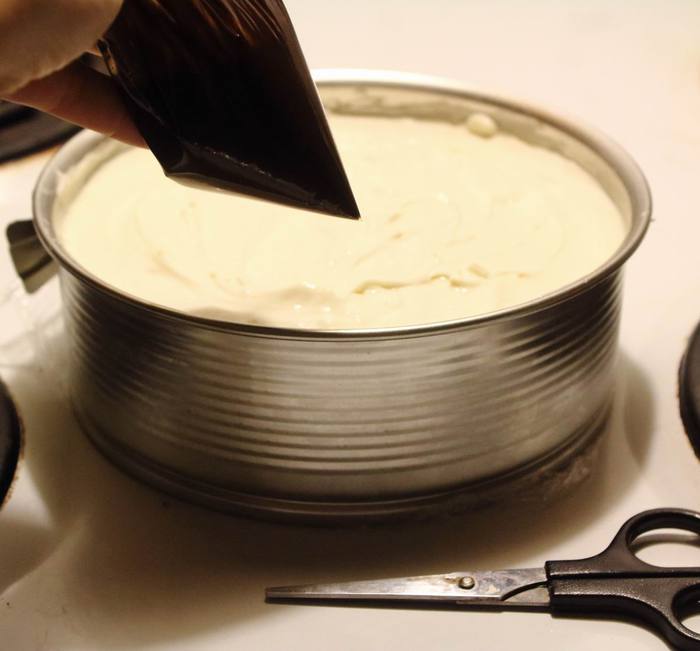 Форму с основой вытащить из холодильника, если есть специальные бортики для чизкейков — проложить их по краю, если нет — то неплохо отстает чизкейк и от просто хорошо смазаных растительных маслом бортиков формы. Выложить массу в форму.