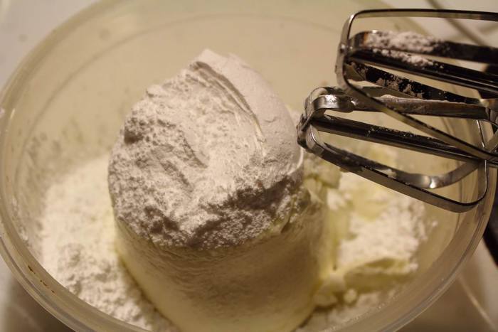 Сливочный сыр размешать до однородности, вмешать в него сахарную пудру, ванильный экстракт и сливки.