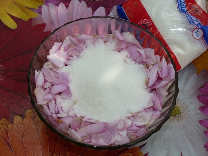 Собрать лепестки в стеклянную посуду и засыпать сахаром.