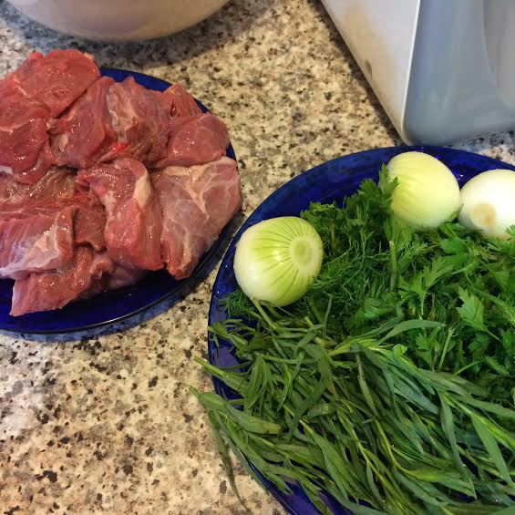 Приготовим фарш: мясо, лук, чеснок и зелень пропустить через мясорубку. Зимой я делаю голубцы так (600 г говядины и 200 г свинины), летом только из говядины. Из смешанного фарша, голубцы получаются более сочные.
