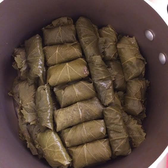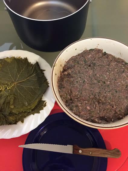В фарш добавляем, промытый рис, соль, перец и 100 (мл) воды. Хорошо перемешиваем и оставляем на 10 минут. Листья у меня армянские, маринованные в банке. Их просто нужно достать из банки и промыть. Листьев может уйти чуть больше или чуть меньше.