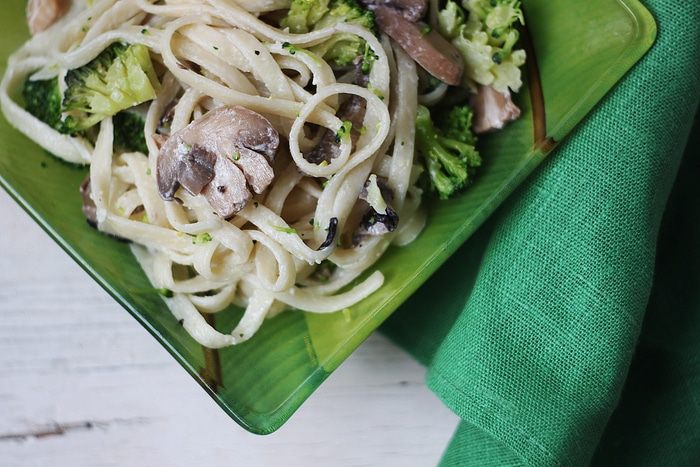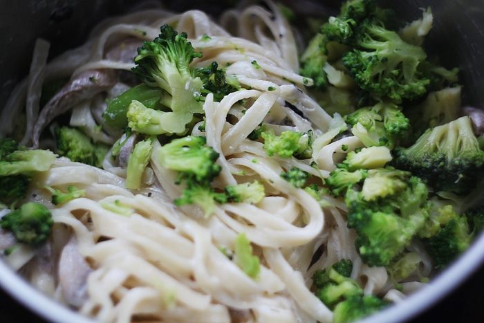 Добавляем брокколи к лапше с грибами и перемешиваем.