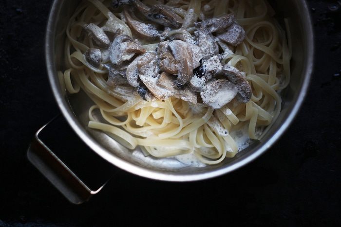 Смешиваем лапшу с грибами.