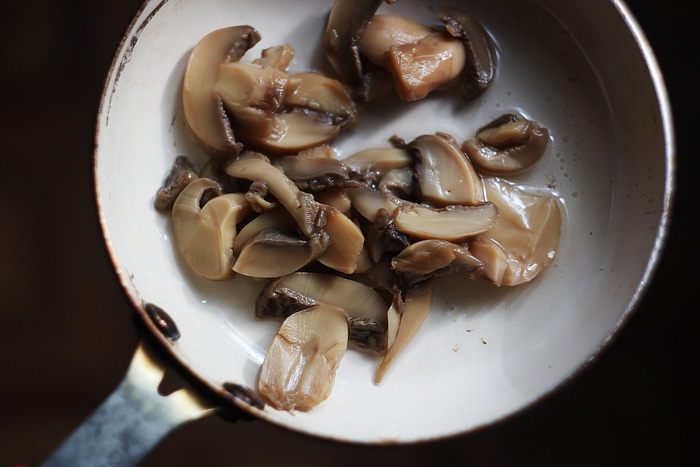 На разогретой с растительным маслом сковороде поджариваем грибы минут 5 — 7 на среднем огне. У меня консервированные, но можно взять и свежие. Количество зависит от вашего желания.