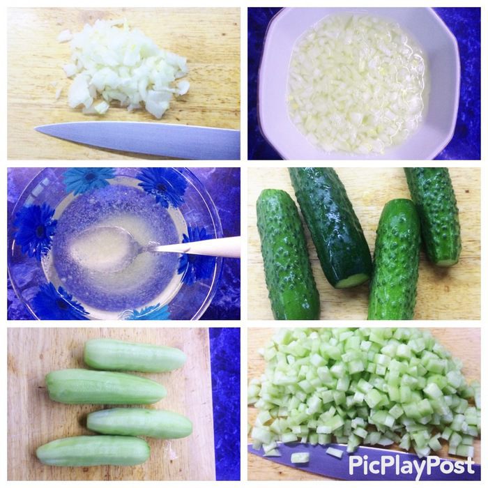 Огурцы почистить от кожицы, нарезать кубиком, посолить и дать постоять минут 15.