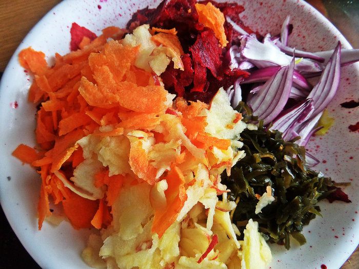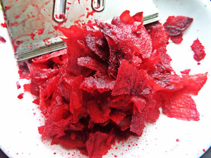 Готовим все овощи. Свеклу сырую натереть лучше так, полуслайсами.