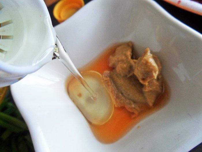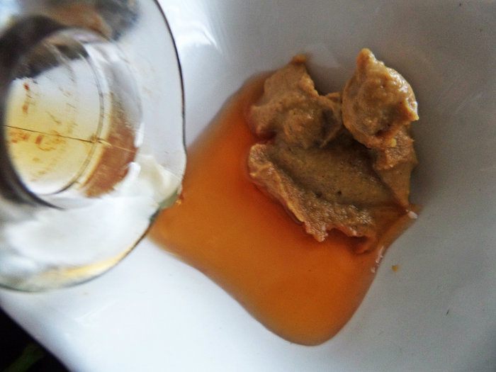 Делаем заправку. В горчицу влить уксус.
