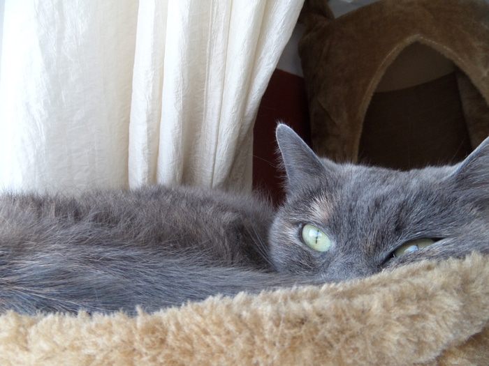 Младшая кошечка Ксю (по-домашнему Ксюня), отдыхает в гамачке, но за всем следит.