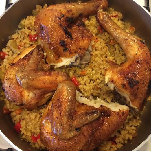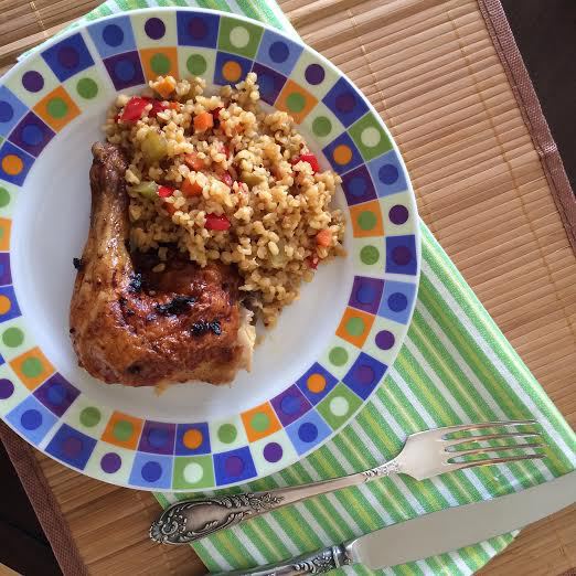 Готовую курицу нарезать, добавить к булгуру с овощами, накрыть крышкой и снять с огня.