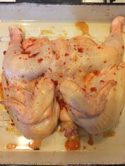 Духовку нагреть до 200°C. Курицу натереть солью и аджикой. Противень слегка смазать оливковым маслом, выложить курицу и запекать до готовности.