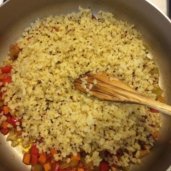 Добавить киноа, булгур, 2 ст.л соевого соуса и перемешать. Потушить 2-3 минутки.