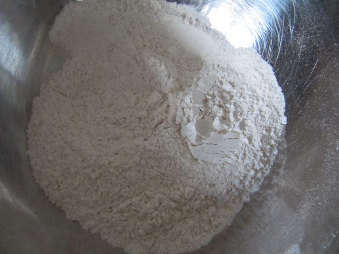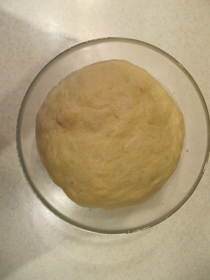 Теплую жидкую смесь соединить с помощью ложки с мучной. Затем постепенно ввести оставшуюся муку (может понадобиться от 1 до 2-х стаканов муки). Тесто должно получиться достаточно "тугим", эластичным и не пристающим к рукам. Скатать тесто в шар, поместить в слегка смазанную растительным маслом миску, накрыть пищевой пленкой и поставить в теплое место на 1 час.