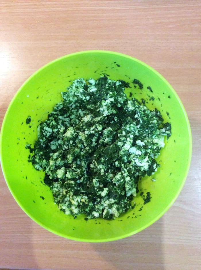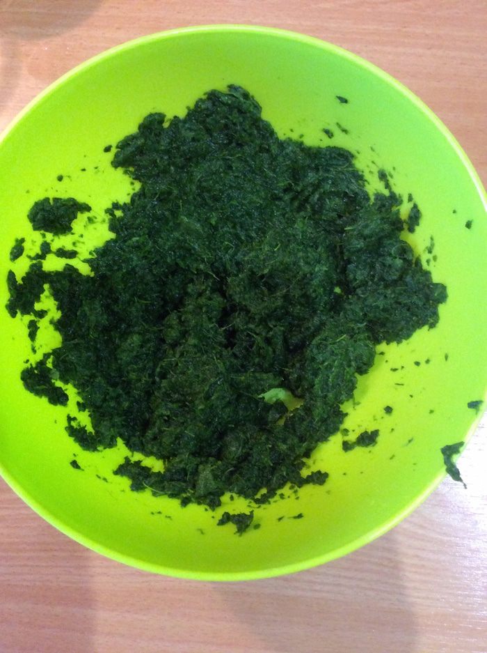 Тесто и шпинат размораживаем. Тесто я беру слоеное бездрожжевое. В упаковке 2 листа. Шпинат замороженный измельченный. Готовим начинку: отжимаем шпинат от влаги, сливаем жидкость.