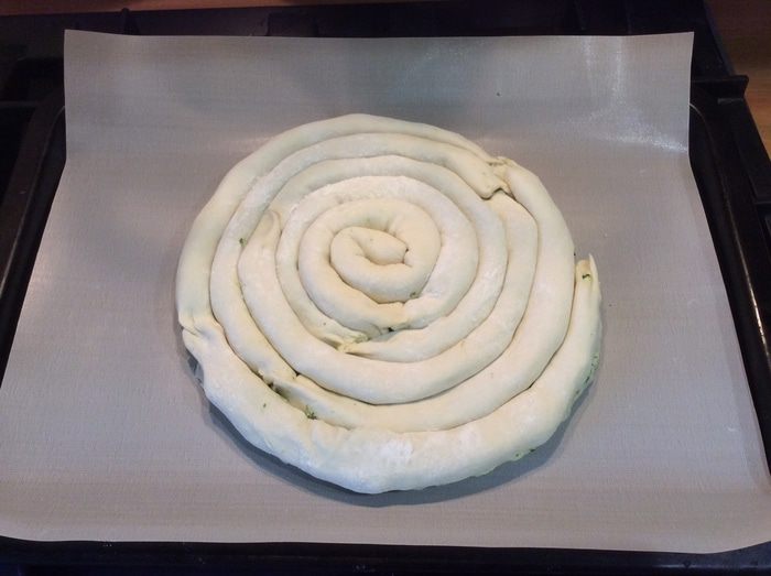 Выкладываем наши колбаски на противень швом вниз, начиная с середины. Скрепляем их между собой.