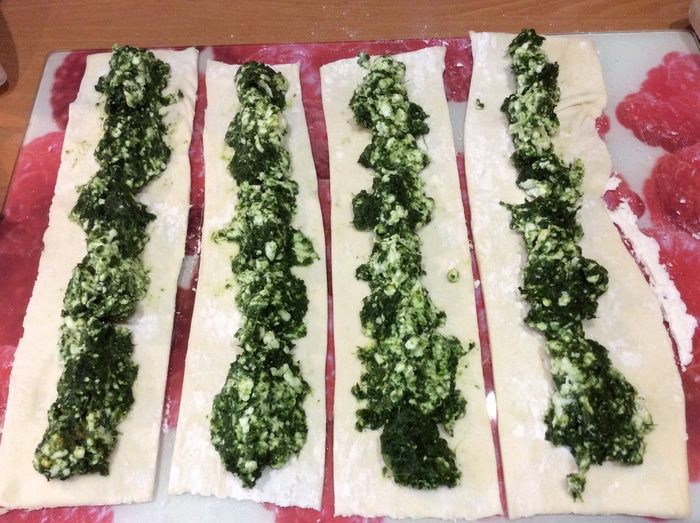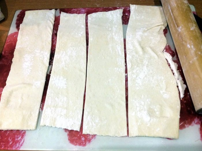 Каждый лист теста немного раскатываем и режем вдоль на 4 одинаковых полоски. Всего получится 8 частей.
