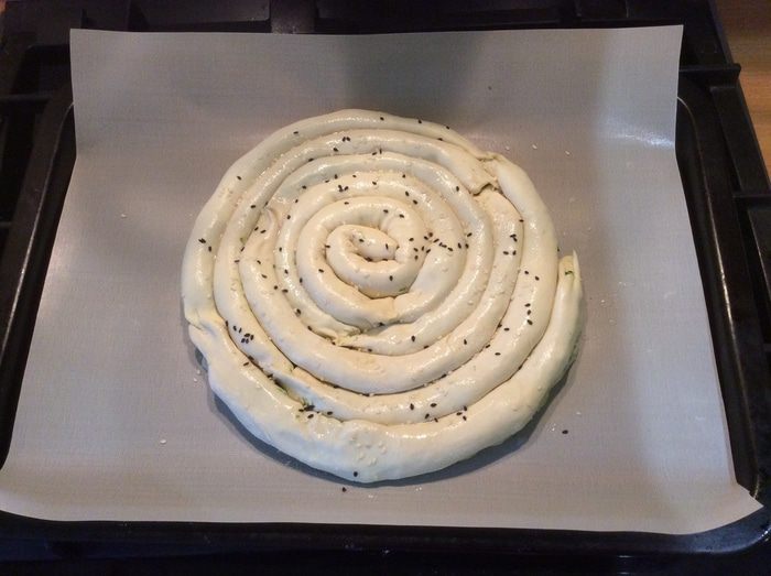 Чтобы пирог лучше подрумянился, нужно смазать его сладкой водичкой. Для этого размешиваем 1 чайную ложку сахара в 1/4 стакана воды. Для украшения сверху посыпаем спиральный пирог кунжутом.