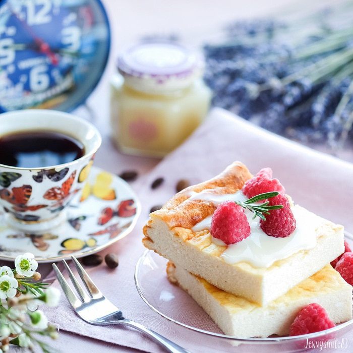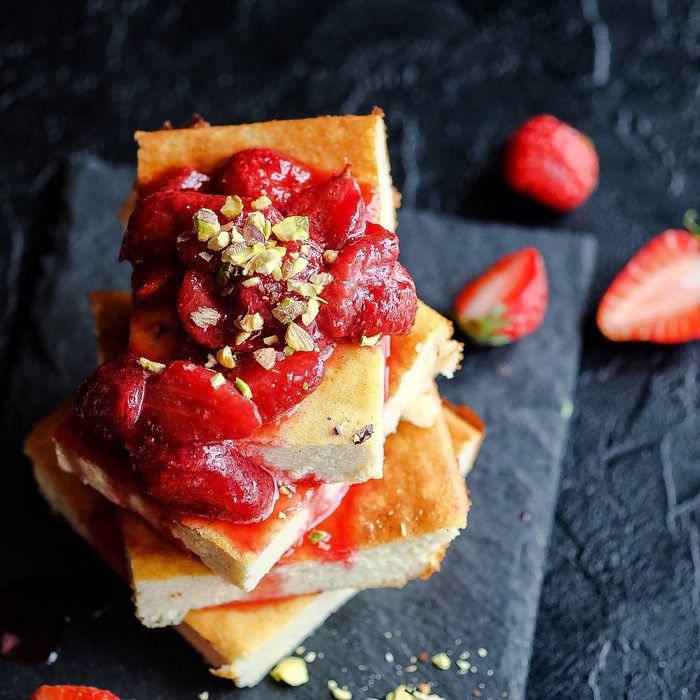 Пока запеканка остывает (ей надо дать остыть хотя бы минут 20, чтобы она "схватилась"), готовим клубничный соус. Клубнику чистим, моем, разрезаем на 2 или 4 части. Кладем в сотейник, добавляем сахар и оставляем клубнику с сахаром минут на 10, чтобы ягоды дали сок. Затем ставим сотейник на средний огонь и варим соус около 10 минут.