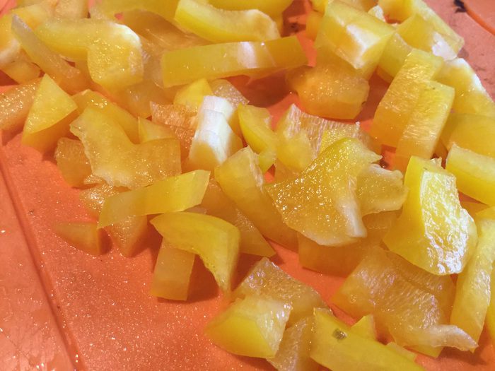 У болгарского перца удалите семена, нарежьте тонкими полосочками.
