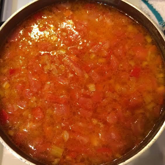 Тушим лук и чеснок до золотистого цвета, добавляем томатную пасту. Потом добавляем остальные овощи и тушим все минут 5.