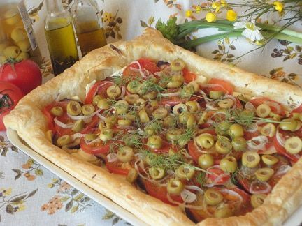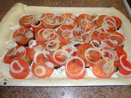 Слоеное тесто выкладываем на смазанный маслом противень. На него кусочки сыра Фетакса или брынзы. Сверху кружочки баклажанов, затем помидоры и колечки лука. Конечно, если есть свежий тимьян, то лучше его использовать(только листочки), я посыпала сухим.