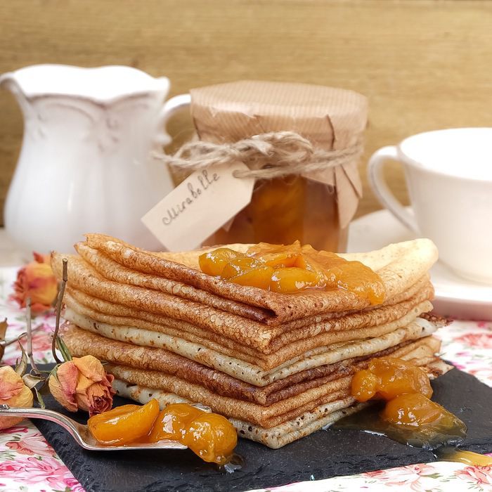 Я уже десятки раз пекла эти блины, поэтому вот фото различных сервировок. Блины с вареньем из желтой сливы "Мирабель".