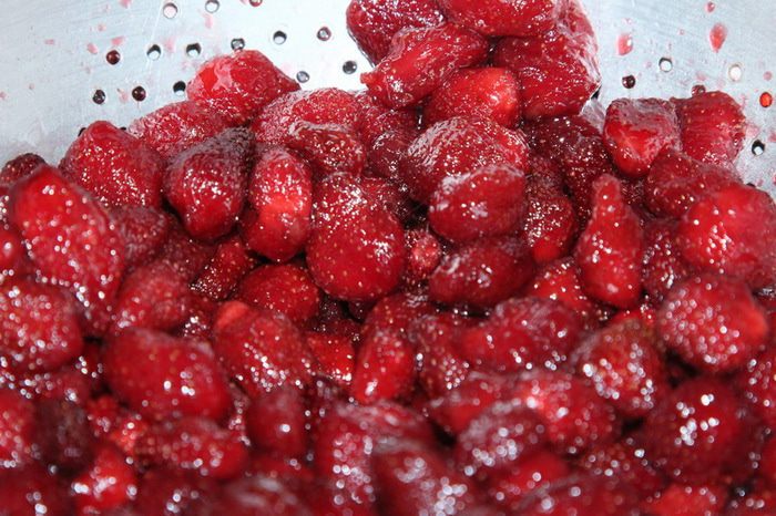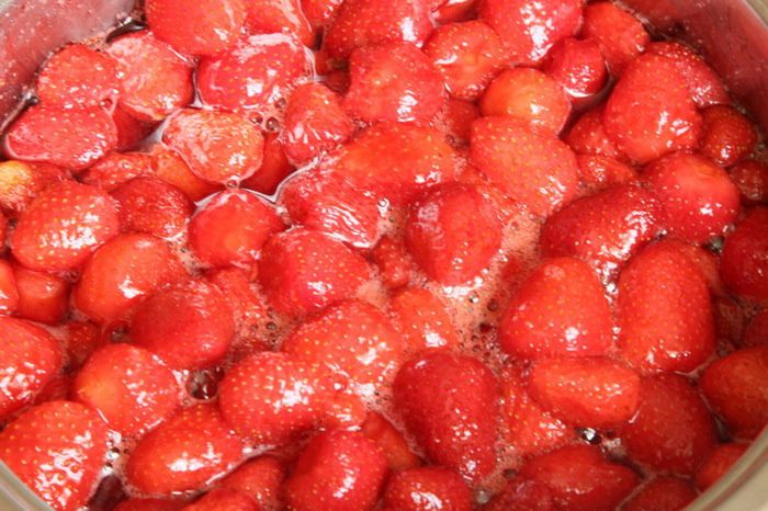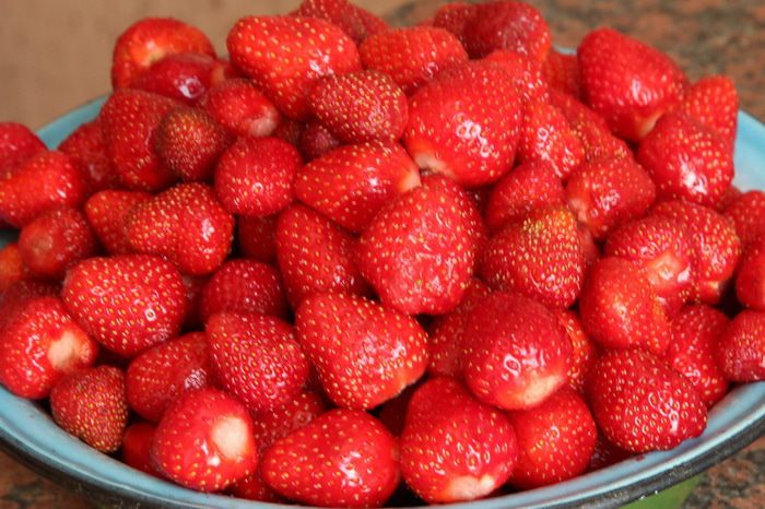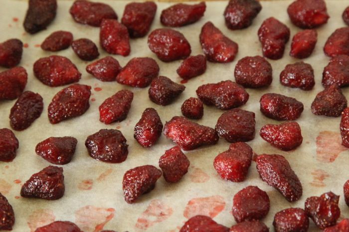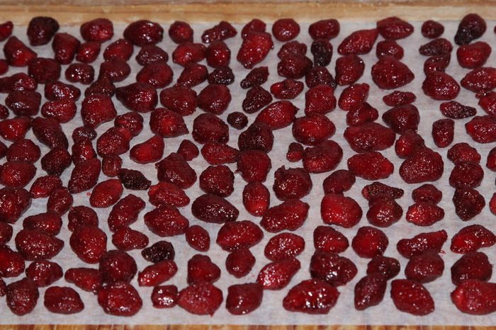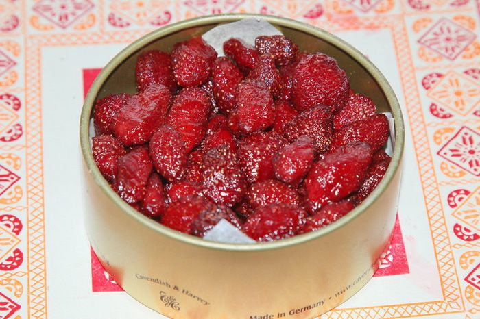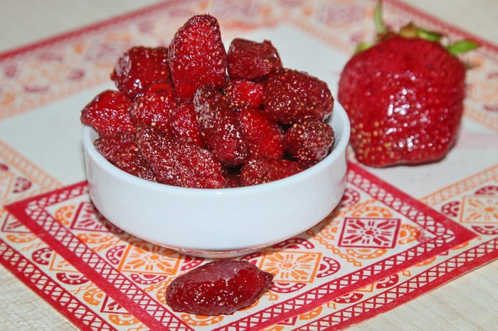 Сегодня хочу предложить вам необычный рецепт, как я и люблю. Готовлю такие цукаты каждый год, но вот сфотографировать процесс все было недосуг. Ну вот — сбылось! Рецепт из серии «придется повозиться», но резульатат того стоит. Особенно тем, кто занимается изготовлением тортов и различной выпечки на продажу. Да и для себя любимой: зимой вместо конфет — милое дело. Для тех у кого собственная клубника и хочется испробовать что-то новенькое — добро пожаловать. Рецепт не хлопотный, но продолжительный во времени: у меня на это уходит, при солнечной погоде, ровно неделя. Вот эту порцию я уже упрятала в морозильную камеру (можно просто в холодильнике), а вторая порция сегодня отправится сушиться и я сразу закладываю третью: клубника у нас этом году уродила, так что запасусь. Из 1,5 кг получается 350 грамм цукатов. Если начинать делать в выходные дни, то за 1,5 дня можно пропитать клубнику сиропом, а потом уже сушка: либо в духовке при температуре 90°С — часов 8, либо так как я — на доске и пусть сама сохнет на застекленном балконе. Мне так больше нравится. Затем цукаты можно пересыпать сахаром и хранить в плотно укупоренной посуде, в прохладном месте. Я раскладываю в небольшие контейнера по 150 грамм и храню, если есть возможность, в морозильной камере, если нет такой возможности — в холодильнике. Ну, и бонусом мы еще получаем чуть больше 0,5 л насыщенного, тягучего и безумно ароматного клубничного сиропа, с которым не сравнится никакой покупной. Его тоже можно использовать для пропитки бисквитов, в каши, в десерты, да мало ли куда... Как говорится — был бы сироп, а проблему мы себе сами найдем! Я, например, и в кофе добавляю, как топинг. Ну, кажется все рассказала, ничего не забыла...