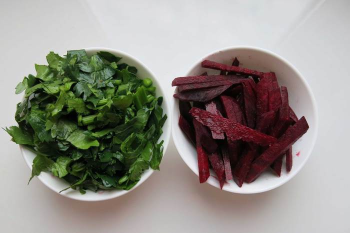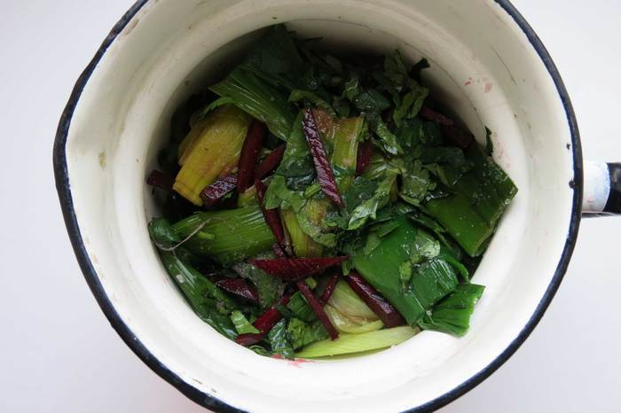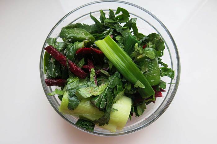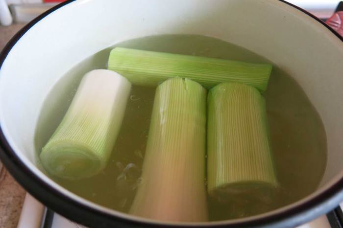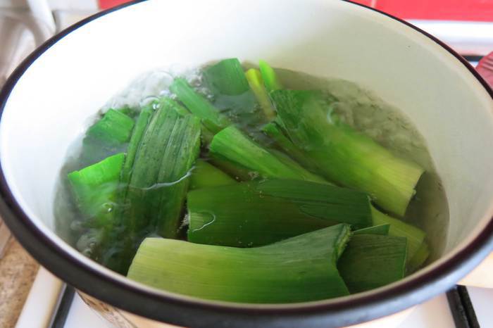 Отвариваем в кипящей воде зеленую часть порея 2-3 минуты.