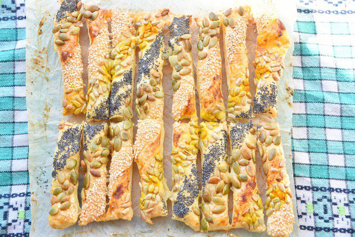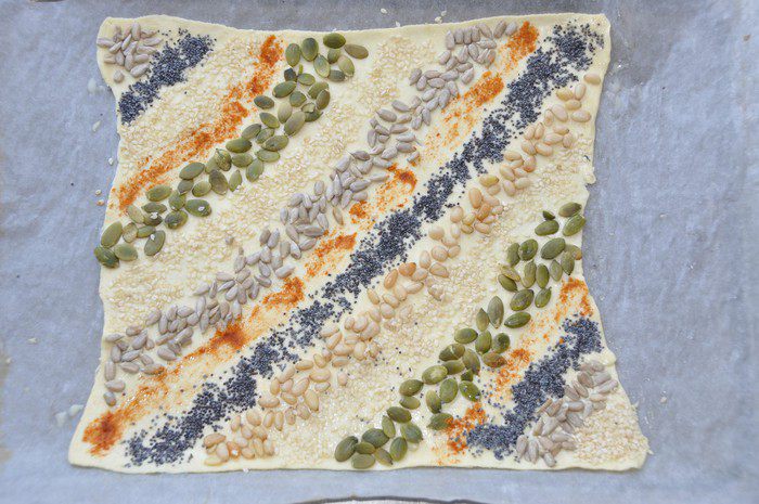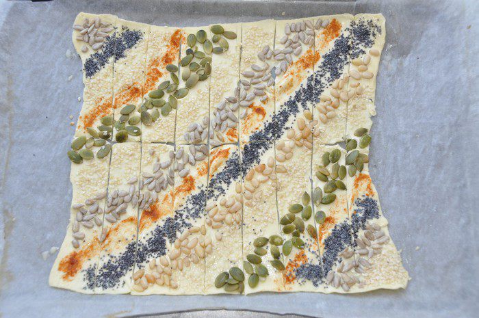 Этот набор посыпок выбран методом проб и ошибок и гарантировано нравится всем, кто пробует. Настоятельно рекомендую не отказывать от перца — он придает пикантности нашим слойкам. Регулируйте количество на свой вкус.
