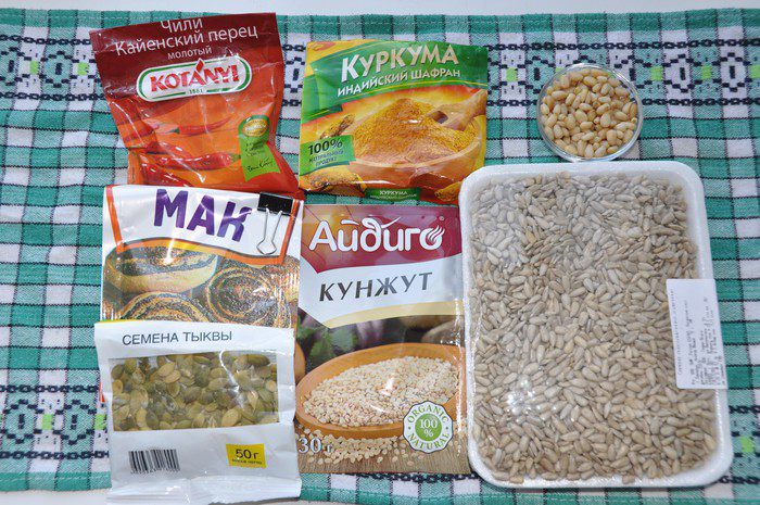 Приготовим семена, орехи и пряности для посыпки.