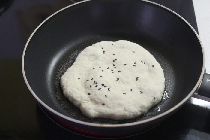 Разогреем растительное масло на сковороде и выложим лепешку. Лепешка на глазах начинает набухать.