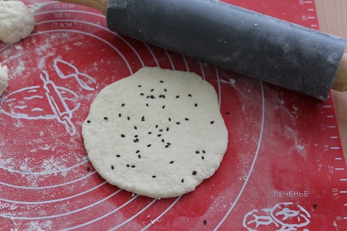 Насыпаем щепотку кунжута и раскатываем лепешку с одной стороны. Потом перевернем, снова насыпаем кунжут и прокатаем снова скалкой.